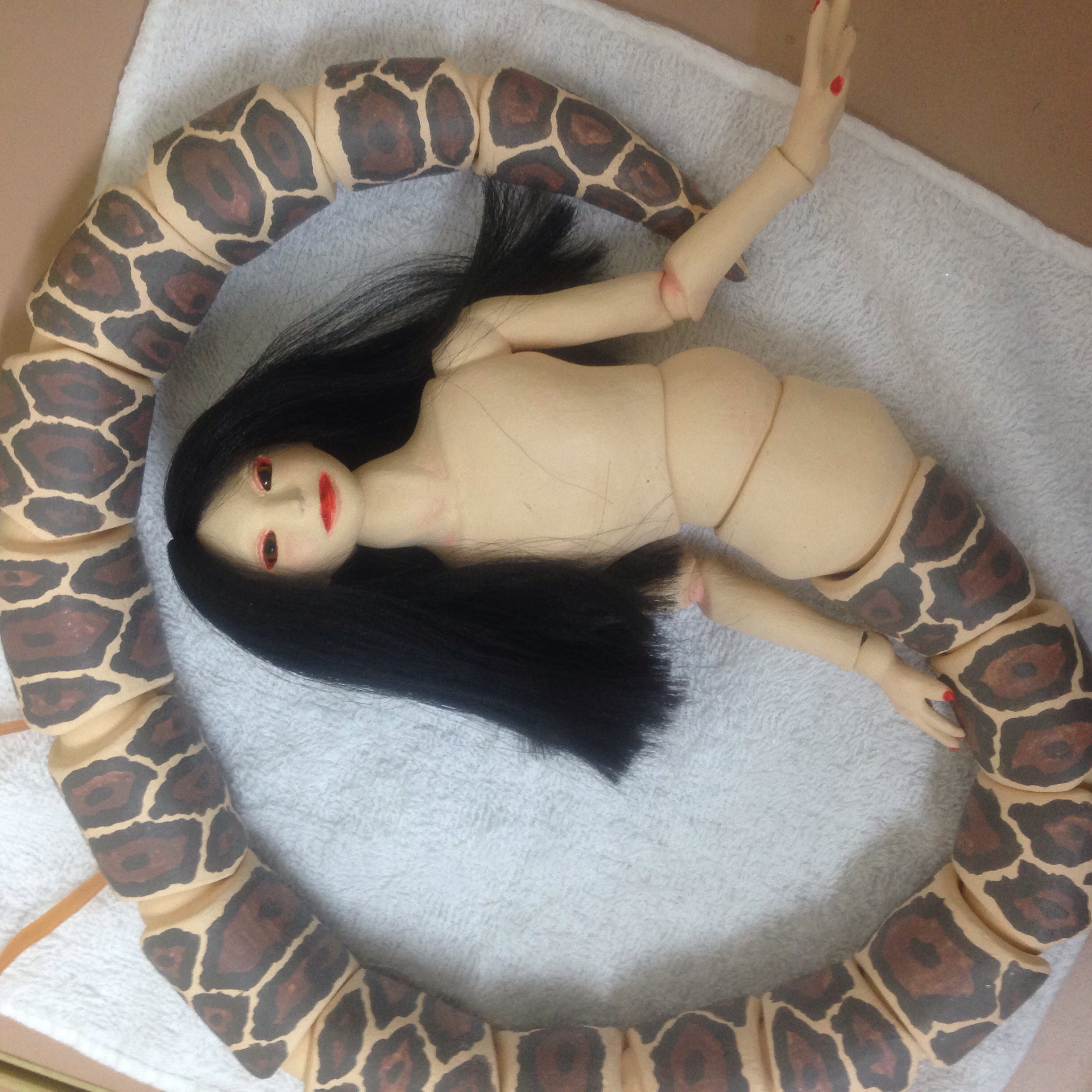 球体関節人形四作目を作りはじめました。 お題は安珍清姫。 造形はラミアをイメージし、妖艶でありながら中性的な雰囲気を出そうと努力しています。服装等は今回ゴスをイメージし、これまでの和風ドールとはまた違った方向になると思います。 嫉妬や怒り、その感情の機微の入り混じったような、そんな表情や仕草を人形という受動的なものに押し込め、形作れたらそれは素晴らしい達成感だと思うのです。 最近人に見せることや紹介することが多くなり、他人からの評価をもらえる快感を知りました。これは狂う人もいるな、と。 そこで、身内ではない他人からの評価ー客観的な評価ーが気になるし、やはり認められたいという欲求もあり、デザフェスのようなイベントに出してみたいと思うようになりました。 以前は妖怪造形大賞を目指して作ってみようとしましたが、職業の上での行き詰まり?等でアイディアがまとまらず頓挫しました。ので、今度は完成のメドがたってから決断をしようと思っています。 次に作るは、地獄太夫九相人形。地獄柄の着物を纏い此の世の苦しむ人々を哀れんだ教養高き太夫、その死体の九つの相を人形にしようという、我ながら悪趣味なコンセプト。 相に想を重ね少しでも此の世の地獄を表せたら、と思います。 |