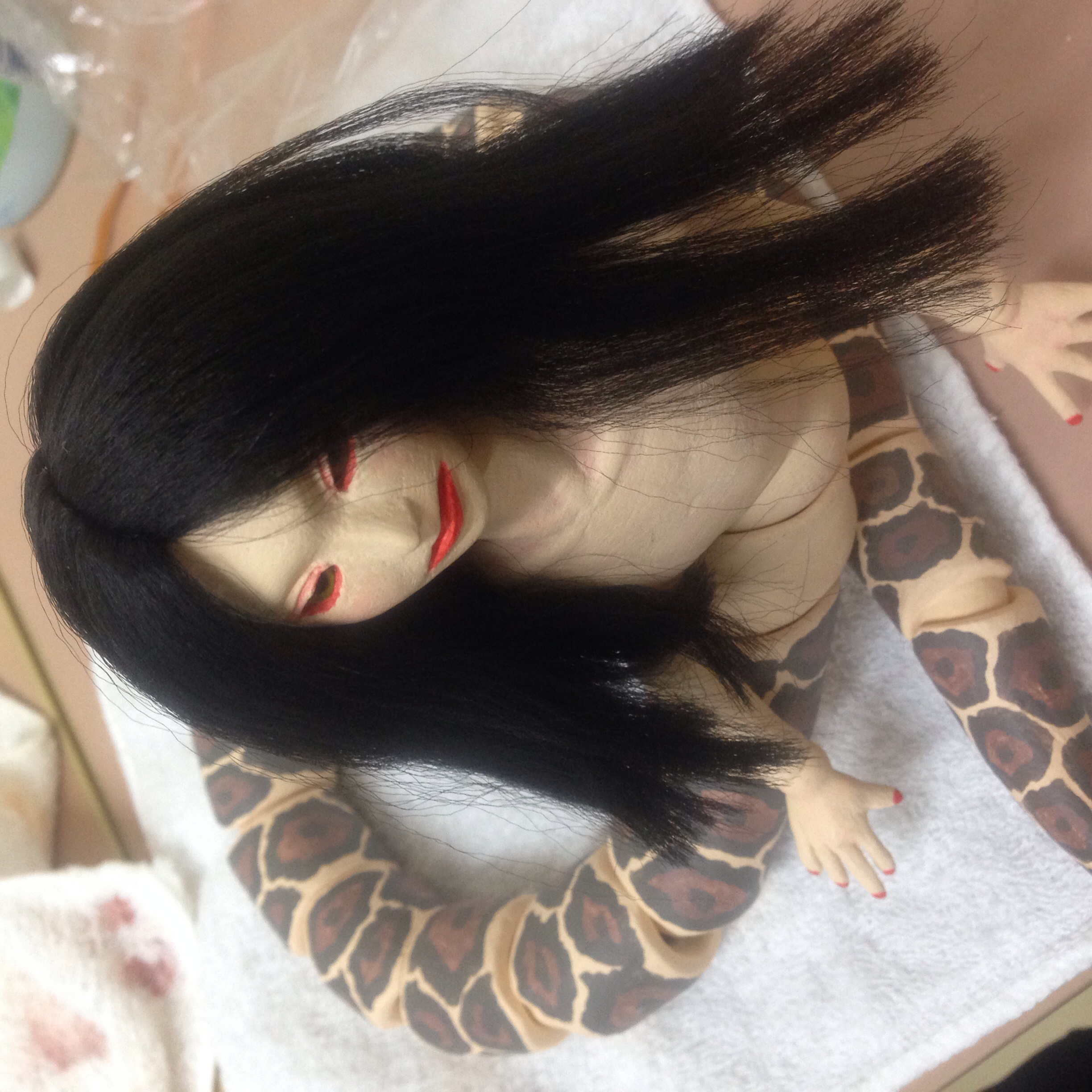 球体関節人形四作目を作りはじめました。 お題は安珍清姫。 造形はラミアをイメージし、妖艶でありながら中性的な雰囲気を出そうと努力しています。服装等は今回ゴスをイメージし、これまでの和風ドールとはまた違った方向になると思います。 嫉妬や怒り、その感情の機微の入り混じったような、そんな表情や仕草を人形という受動的なものに押し込め、形作れたらそれは素晴らしい達成感だと思うのです。 最近人に見せることや紹介することが多くなり、他人からの評価をもらえる快感を知りました。これは狂う人もいるな、と。 そこで、身内ではない他人からの評価ー客観的な評価ーが気になるし、やはり認められたいという欲求もあり、デザフェスのようなイベントに出してみたいと思うようになりました。 以前は妖怪造形大賞を目指して作ってみようとしましたが、職業の上での行き詰まり?等でアイディアがまとまらず頓挫しました。ので、今度は完成のメドがたってから決断をしようと思っています。 次に作るは、地獄太夫九相人形。地獄柄の着物を纏い此の世の苦しむ人々を哀れんだ教養高き太夫、その死体の九つの相を人形にしようという、我ながら悪趣味なコンセプト。 相に想を重ね少しでも此の世の地獄を表せたら、と思います。 |